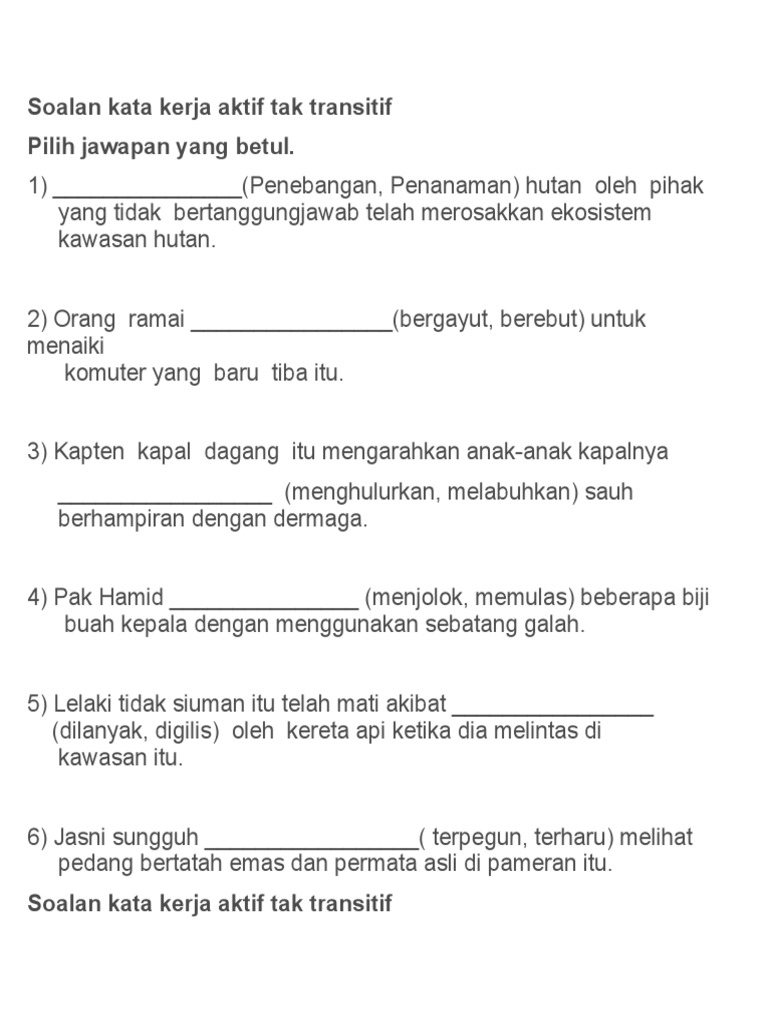 Kami suka _____ di taman pada hujung minggu. Latihan Kata Kerja Aktif Transitif Tahun 5 Latihan Tatabahasa This is actually a short article or even graphic around the Latihan Kata Kerja Aktif Transitif Tahun 5 Latihan Tatabahasa if you. Opsi b tidak boleh menggunakan dua kata hubung sekaligus yaitu.